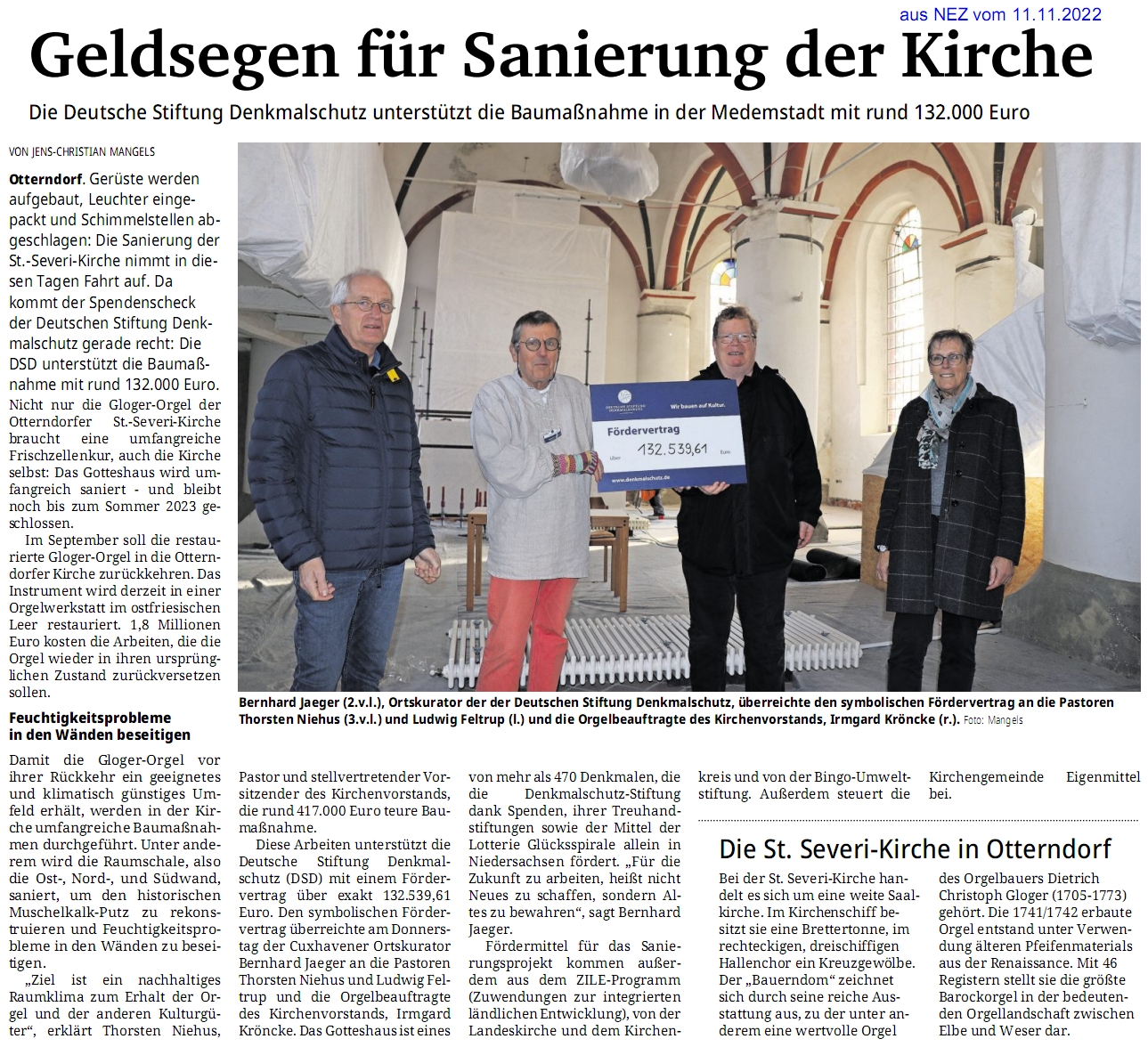 Gerüste werden aufgebaut, Leuchter eingepackt und Schimmelstellen abgeschlagen: Die Sanierung der St.-Severi-Kirche nimmt in diesen Tagen Fahrt auf. Da kommt der Spendenscheck der Deutschen Stiftung Denkmalschutz gerade recht: Die DSD unterstützt die Baumaßnahme mit rund 132.000 Euro.